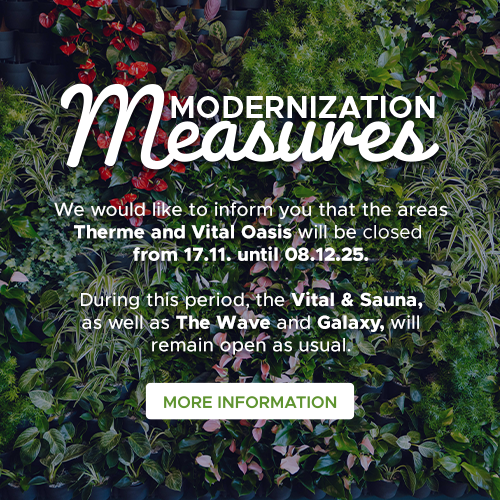 Our textile family areas Therme offer fun and action for young and old. On 2,850 metres of slides, you can choose from 28 water slides in three levels of difficulty. Relax in the huge The Wave and the numerous health pools in the thermal baths or simply let yourself drift in the Crazy River.