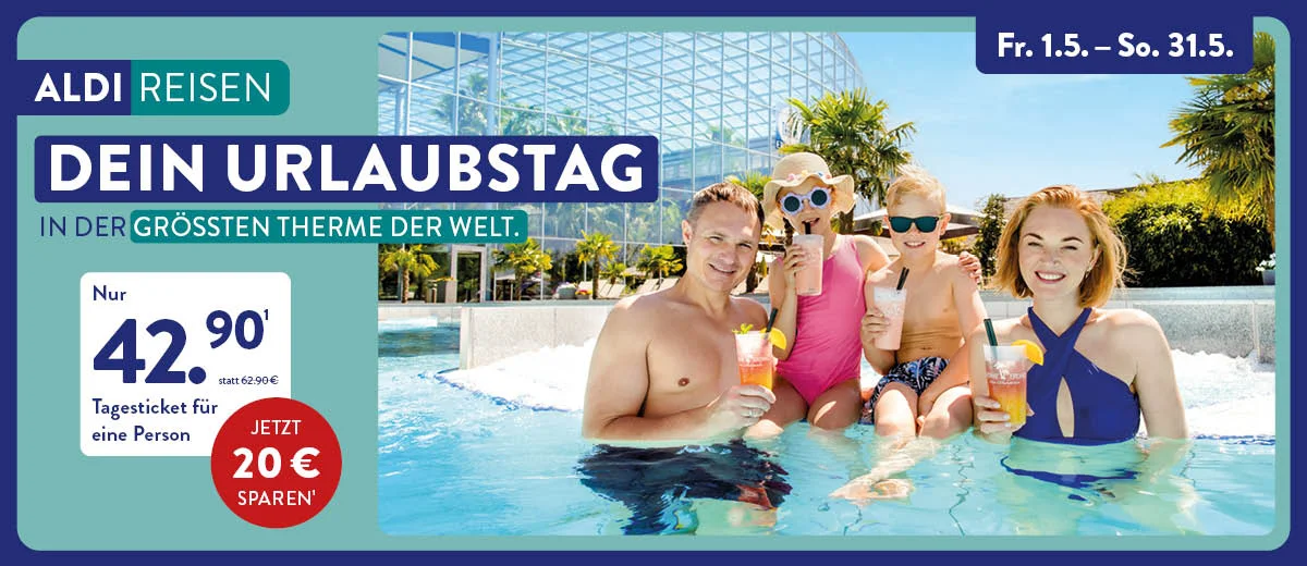 Im Aktionszeitraum von Freitag, den 1. Mai 2026 bis Sonntag, den 31. Mai 2026 kannst du gemeinsam mit ALDI REISEN online ein Tagesticket für eine Person erwerben und dabei 20,- € sparen!
