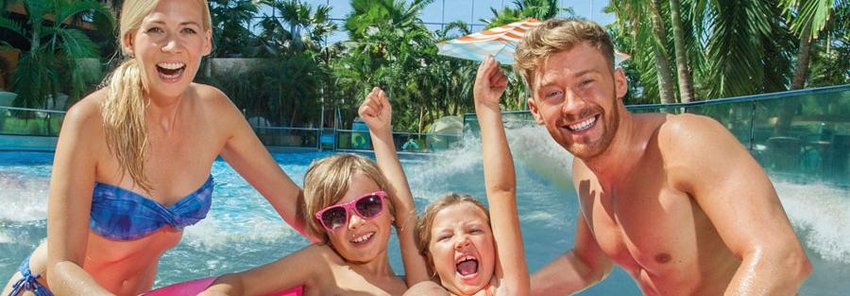 Eltern mit zwei Kindern stehen vor dem Crazy River im Außenbereich und jubeln.
