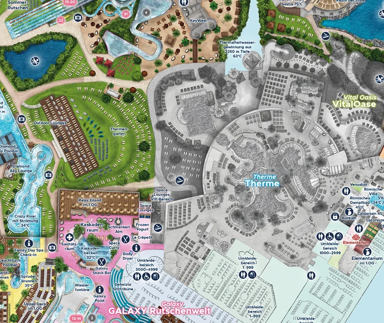 - Entdecken Sie andere offene Bereiche wie die VitalTherme & Saunen, das Wellenbad & die Galaxy Rutschenwelt