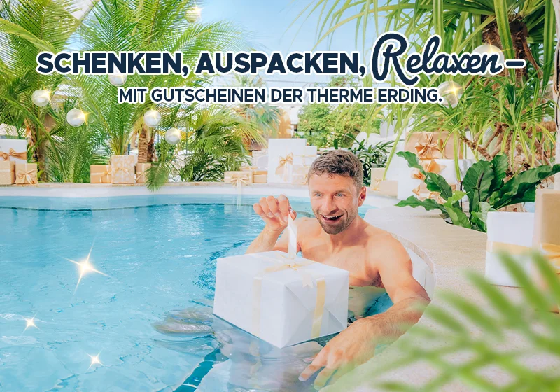 *gültig für eine Person im Zeitraum 08.12.25-24.12.25 und 07.01.26-30.06.26 beim Kauf einer Tageskarte oder eines 6-Stunden Tickets für die Therme Erding. Nicht mit anderen Rabattaktionen kombinierbar. Keine Barauszahlung möglich. Pro Person ist ein Gutschein einlösbar.