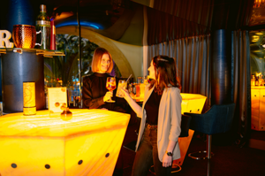Freuen Sie sich auf fruchtige Cocktails in unserer Kaleidoskop Bar mit Blick auf das Meer aus Palmen und das türkisfarbene Wasser des Wellenbads der Therme Erding.